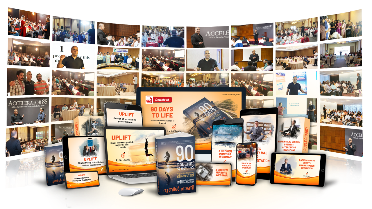 ആണെങ്കിൽ നിങ്ങളുടെ Sales ൻ്റെ Closing 50% കൂട്ടാനായിട്ടുള്ള Strategies & Techniques സൗജന്യമായി പഠിക്കുവാൻ താല്പര്യമുണ്ടെങ്കിൽ സിലിക്കൺ വാലിയിൽ Business Owners നെ Coach ചെയ്യുന്ന 90 Days to Life എന്ന international Best Selling Book ന്റെ Author ആയ Ruble Chandy യുടെ 7 ദിവസ സൗജന്യ Online Training Session. നിങ്ങൾ നിങ്ങളുടെ ബിസിനസ്സിലേക്ക് ചെയ്യുന്ന ഏറ്റവും വലിയ Investment ആയിരിക്കും ഈ 7 ദിവസം,